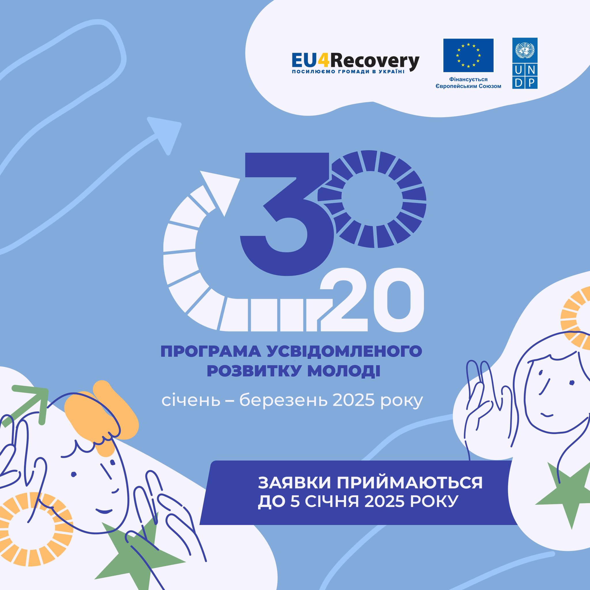 НОВИНИ 28 грудня 2024 ЄС та ПРООН В УКРАЇНІ ЗАПУСКАЮТЬ НОВУ ІНІЦІАТИВУ - ПРОГРАМУ УСВІДОМЛЕНОГО РОЗВИТКУ МОЛОДІ «20 - 30» Детальніше...