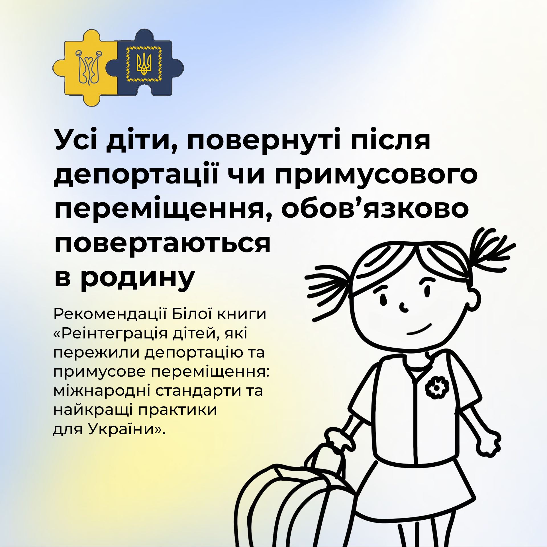 НОВИНИ 09 січня 2025 УСІ ДІТИ ПІСЛЯ ДЕПОРТАЦІЇ ЧИ ПРИМУСОВОГО ПЕРЕМІЩЕННЯ МАЮТЬ БУТИ ІНТЕГРОВАНІ В СІМЕЙНЕ ОТОЧЕННЯ Детальніше...