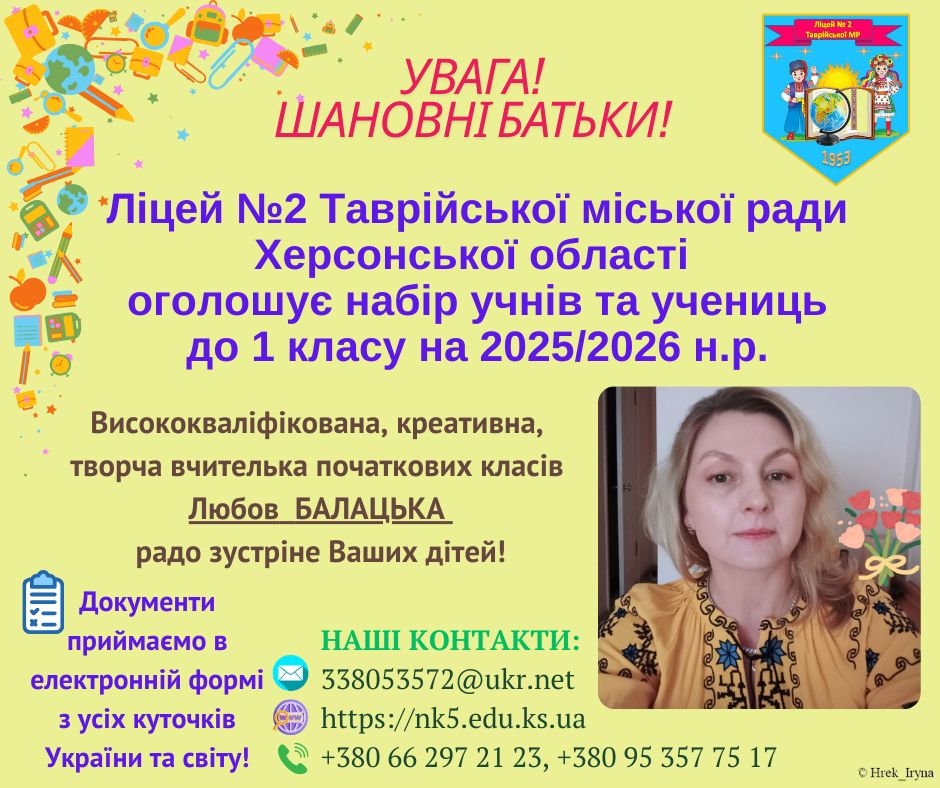 НОВИНИ 13 січня 2025 ЛІЦЕЙ №2 ТАВРІЙСЬКОЇ МІСЬКОЇ РАДИ ОГОЛОШУЄ НАБІР ДО ПЕРШОГО КЛАСУ НА НАСТУПНИЙ НАВЧАЛЬНИЙ РІК