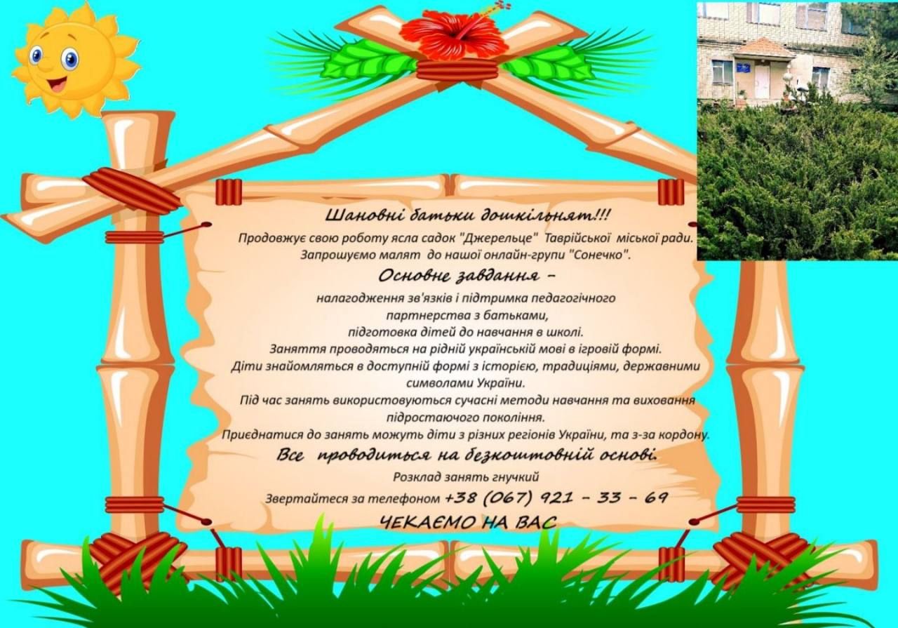 НОВИНИ 20 серпня 2025 ЯСЛА-САДОК "ДЖЕРЕЛЬЦЕ" ТАВРІЙСЬКОЇ МІСЬКОЇ РАДИ ЗАПРОШУЄ ДОШКІЛЬНЯТ ДО ОНЛАЙН-НАВЧАННЯ