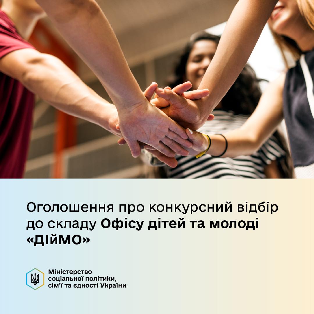 НОВИНИ 29 серпня 2025 ОГОЛОШЕНО КОНКУРСНИЙ ВІДБІР ДО СКЛАДУ ОФІСУ ДІТЕЙ ТА МОЛОДІ "ДІйМО" Детальніше...