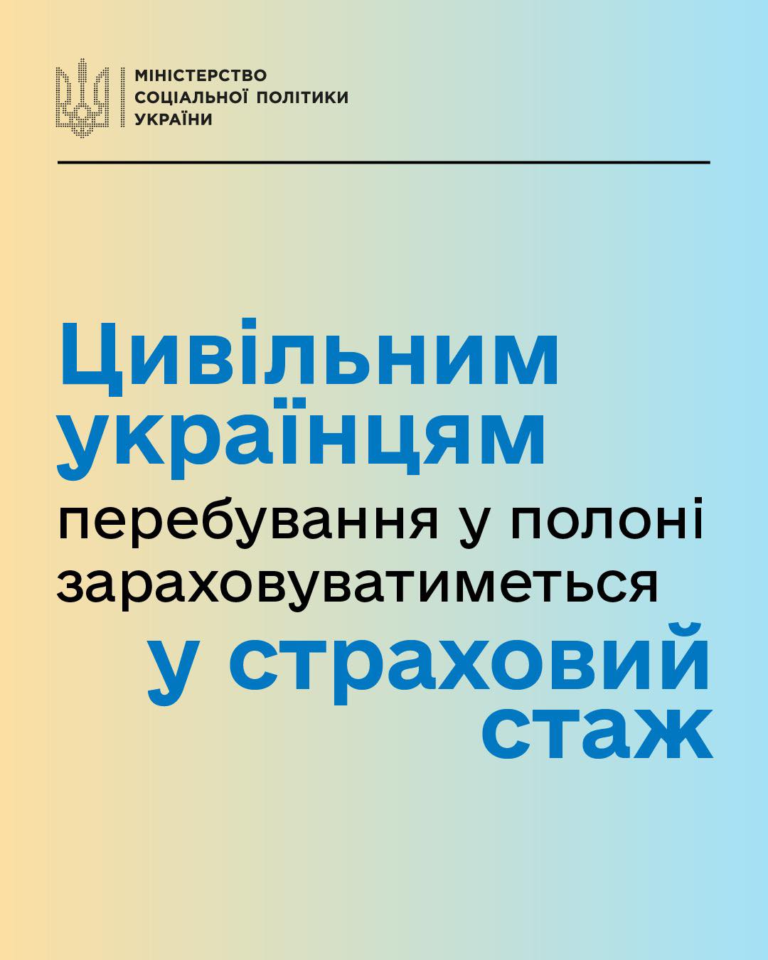 НОВИНИ 29 березня 2025 ПЕРІОД ПЕРЕБУВАННЯ ЦИВІЛЬНИХ УКРАЇНЦІВ У ПОЛОНІ БУДЕ ЗАРАХОВАНИЙ У СТРАХОВИЙ СТАЖ Детальніше...