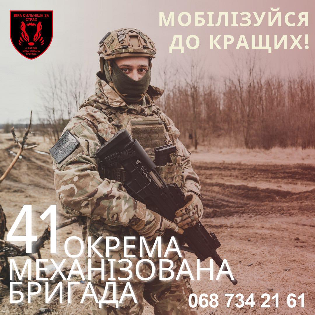 НОВИНИ 12 квітня 2025 41 ОКРЕМА МЕХАНІЗОВАНА БРИГАДА - ПІДРОЗДІЛ СПРАВЖНЬОГО БОЙОВОГО БРАТЕРСТВА. ПРИЄДНУЙСЯ! Детальніше...
