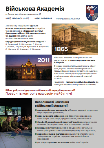 Мрієш про престижну військову освіту та перспективне майбутнє? Військова академія (м. Одеса) – це сучасний міжвидовий військовий навчальний заклад із понад столітньою історією та глибокими традиціями. Ми готуємо висококласних офіцерів для Збройних Сил України та інших військових формувань за освітньо-кваліфікаційними рівнями «бакалавр» і «магістр».